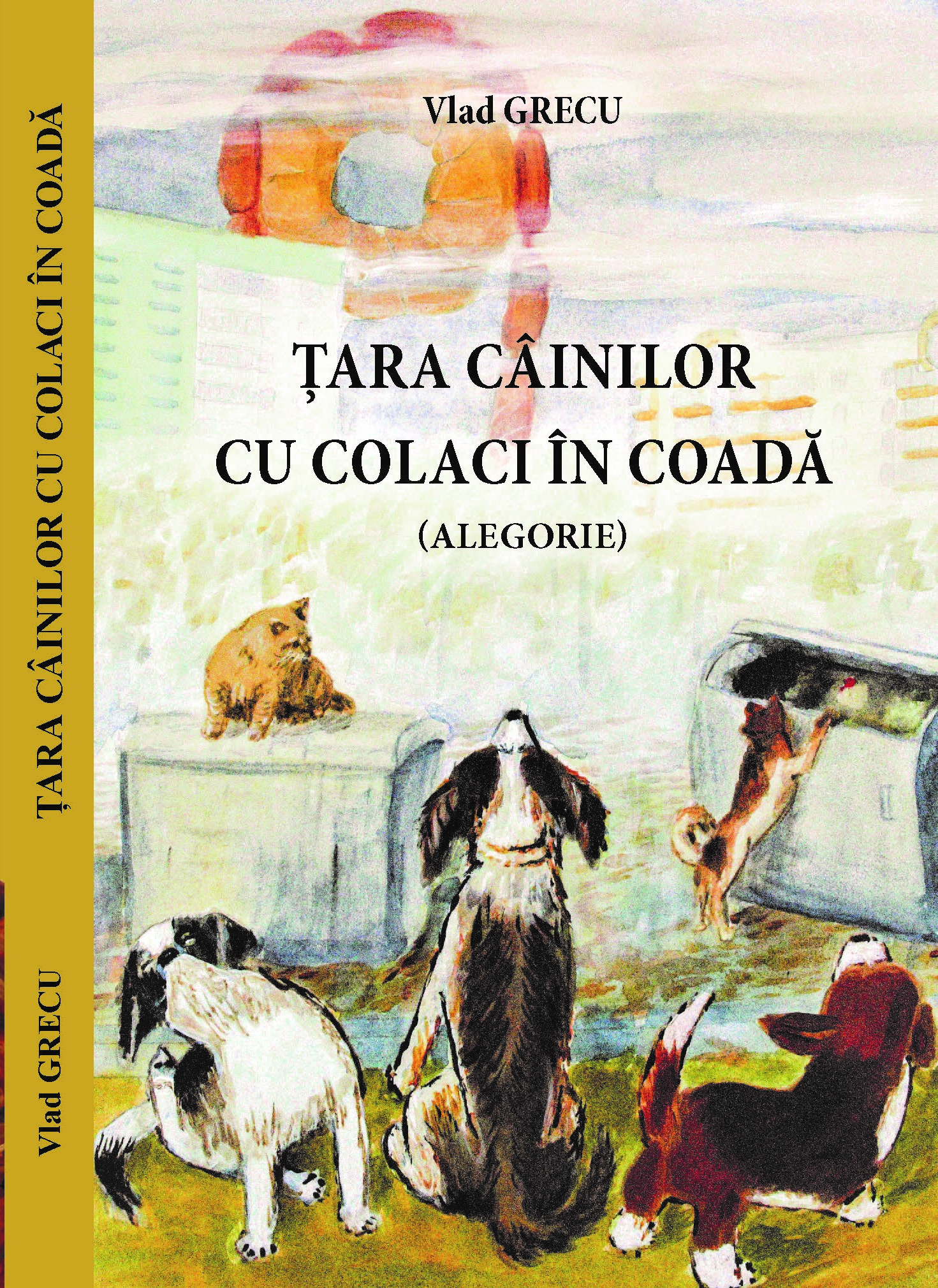 „Țara Câinilor cu colaci în coadă” devine, la un moment dat, conștientizarea traseului nostru derizoriu spre o viață mai bună, iar acest roman este, poate că, cea mai bună pereche de palme pe care am primit-o pentru a ne trezi și a înceta să m ai ducem o viață de câine. Idealurile umane, materializate într-o „epopee” canină, condimentată generos cu o fină erudiție paremiologică, umor, aluzii și dezveliri până la os ale rănilor ce mocnesc încă în trupul poporului nostru, iată ce intenționează a fi călătoria alegorică spre „Țara Câinilor cu colaci î n coadă”. Cartea lui Vlad Grecu îmbracă în haina poveștii despre aventurile unui câine o mărturie sinceră a evoluției ori, mai bine zis, a involuției noastre, celor cu rădăcini nobile, dar fructe amare. Omul tipic, subjugat de instincte și circumstanțe, apare în ipostaza câinelui Grivei (o potaie obișnuită), care, pentru „o strachină de costiţe”, se arată bucuros să fie legat, ba chiar este gata să facă sluj cu plăcere. Totuși, acest tip comun, ca orice erou civilizator, se pomenește în fața libertății ca o alternativă la viața de slugă, de prizonier. Alternativă jinduită datorită nivelului său de trai mizer, care-l strânge la perete, și datorită „filosofului” — câinele Bartholomew (un Rottweiler), care îi deschide ochii asupra descendenței sale dintr-un soi nobil (de lupi) și îi stârnește sentimentul de demnitate, subjugat din naștere de lanț și injuriile „educative” ale stăpânului. Și pentru că la fapte eroice moldovenii nu merg singuri, Grivei, de aici încolo Griv își ia verișorul Bobik, potaia, deja iluminată și rebotezată — Bobby. Inovarea în manieră englezească a numelor (o modă încă vie) ar fi fost primul pas spre emancipare, pentru că, așa cum afirmă „filosoful” lor: „Când începi o viaţă nouă, trebuie să-ţi revizuieşti mai întâi de toate identitatea!”. Odată ahtiați după libertate, cei doi verișori devin de neoprit pentru că demolarea interdicțiilor din viața de sclav devine un adevărat drog pentru aceștia. Apropo, unul care pe lângă plăcere, provoacă și durere, pentru că „Libertatea e un lucru bun, dar nu şi atunci când, născut şi educat în captivitate, eşti aruncat aşa, hodoronc-tronc, în pădure! (…) Pe lângă acei născuţi să vâneze, ei, acei hrăniţi ca porumbeii din palmă, pierd catastrofal!”, iar la prima vânătoare, se dovedește a fi că „abilitatea lor de ogar vitezoman era i nutilă”. Conștientizarea propriei neputințe îi dezamăgește și îi pune în fața unei realități dure, nici pe departe similare celei din visele lor. Această dezamăgire îl face pe „filosof” să dea bir cu fugiții, renunțând la ideea pentru care milita în fața acestor neinițiați. Uimitor, dar totuși intuit, chiar dorit, a fost faptul că cei doi câini, care au sfărâmat lanțurile sclaviei, și-au continuat calea, întâlnind varii tipologii umane /canine de un colorit impresionant. Fiecare protagonist aduce cu sine, nu doar o probă, un moment de civilizare, de inițiere pentru cei doi eroi, dar și câte o istorie. Autorul romanului adună, prin țesătura acestei povești, tipologii precum: fetele de la oraș (Bulka și Belka), hoinarul (Jerry), corcitura (Valet), descurcărețul cu evidente talente politice (Găinarul), artiștii șomeri (Artemon, Florentin și Fulgușor), băieții de cartier (Chupacabra, Lupoiul, Karlo, Max, Tarzan și Juristul), femeia puternică (Matilda), sportivul (Cuțu), nobilii (Spike, Daisy și Tutankhamon) ș.a. nu mai puțin impresionante. În calea lor spre acel Eldorado al câinilor, cei doi verișori învață cum este viața la oraș, cum se repartizează puterea și mâncarea și ce aspecte varii poate avea relația dintre om și câine (de la eutanasiere la prietenie). Inițierea acestor promotori ai valorilor se poticnește de conștientizarea faptului că visurile foarte rar devin realitate: „ poate că undeva şi ninge cu fulgi de smântână, însă nu aici şi nu acum”. Cei doi verișori, foarte repede înțeleg că nu pot veni într-o comunitate nouă cu propriile reguli, raliindu-i pe toți din jur la viziunea proprie asupra vieții, că nu pot schimba lumea fără a se schimba ei înșiși, care, la un moment dat recunosc: „cu asemenea canalii, jocul se face numai după regulile lor ticăloase”. Eroul principal din acest roman alegoric, Griv încearcă pe propria blană discriminarea, dezamăgirea, înfrângerea și riscul de a muri (ca o javră pe maidan). Acesta câștigă simpatia cititorului prin simplitatea, uneori poate chiar naivitatea sa nativă, prin curajul și demnitatea de care dă dovadă, prin loialitatea și compasiunea față de semeni și oameni, prin faptul că este mai uman decât oricare alt erou al zilelor noastre. Griv pare a fi eroul pe care încă nu îl avem, eroul care încă nu suntem, căci „dacă şi neamul nostru ar fi fost la fel de demn şi curajos, nu ni se mai suia astăzi nimeni în cap…”. „Țara Câinilor cu colaci în coadă” devine, la un moment dat, conștientizarea traseului nostru derizoriu spre o viață mai bună, iar acest roman este, poate că, cea mai bună pereche de palme pe care am primit-o pentru a ne trezi și a înceta să mai ducem o viață de câine. Civilizarea se produce, în roman, nu doar datorită imboldului dat de Bartholomew „filosoful”, ci și de apariția unui „mentor”, unui spirit capabil să privească peisajul de la o altitudine superioară. Astfel, apariția lui Daisy, ca a unui reprezentant al păturii sociale de vârf, este una pedagogică pentru Griv, care înțelege că integrarea într-o societate nu ține doar de adaptarea la regulile existente în ea și egalarea la mârșăvia acesteia, ci și de educație, de culturalizare, civilizare. Ascendența spre o viață mai bună nu se face schimbând